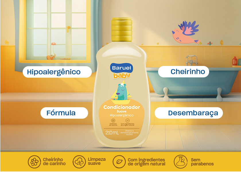 O Condicionador Infantil Baruel Baby Suave é hipoalergênico com ingredientes de origem natural. Para garantir um desembaraço suave e seguro foi testado oftalmologicamente e dermatologicamente.