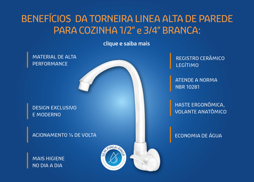 A Torneira ABS Linea Tigre oferece design moderno, alta durabilidade e facilidade de uso. Feita em ABS resistente com proteção anti-UV, possui acionamento ¼ de volta com registro cerâmico, bico arejador que economiza até 50% de água e superfície interna lisa que evita resíduos. Une praticidade, economia e a qualidade Tigre.