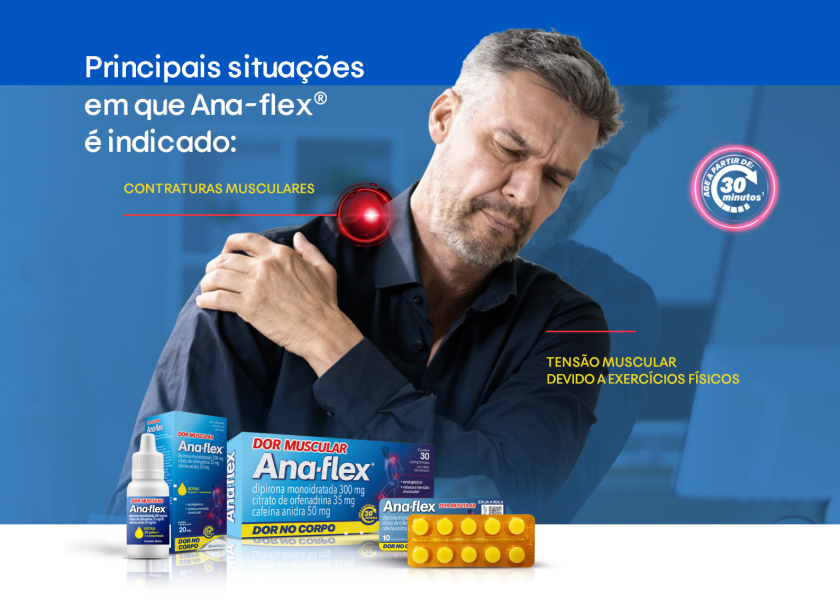 Ana-flex® é um medicamento analgésico e relaxante muscular que combina dipirona 300 mg + citrato de orfenadrina 35 mg + cafeína 50 mg, sendo indicado para o alívio da dor associada a contraturas musculares, incluindo cefaleia tensional¹.
