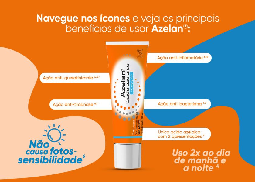 Azelan® (ácido azelaico) MS-1.8569.0012. Indicações: Gel - tratamento da acne e da rosácea papulopustulosa. Creme - tratamento da acne. SE PERSISTIREM OS SINTOMAS, O MÉDICO DEVERÁ SER CONSULTADO. AZELAN® É UM MEDICAMENTO. SEU USO PODE TRAZER RISCOS. PROCURE O MÉDICO E O FARMACÊUTICO. LEIA A BULA.